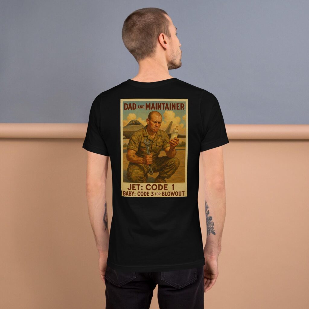 This hilarious and heartfelt t-shirt is made for the men who keep jets flying and babies clean—most of the time. Featuring bold vintage-style artwork of a confused aircraft maintainer holding a baby bottle in one hand and a wrench in the other, this shirt perfectly captures the dual life of military dads. An F-22 looms in the background under a bright midday sky, showing he’s always mission-ready—even when that mission involves diapers.